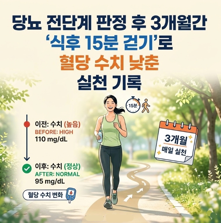 지금 잡지 않으면 1~2년 안에 평생 당뇨약을 달고 살아야 한다는 경고에, 저는 그날부터 독하게 혈당 관리에 돌입했습니다. 그리고 그 핵심 무기는 '식후 15분 걷기'였습니다.